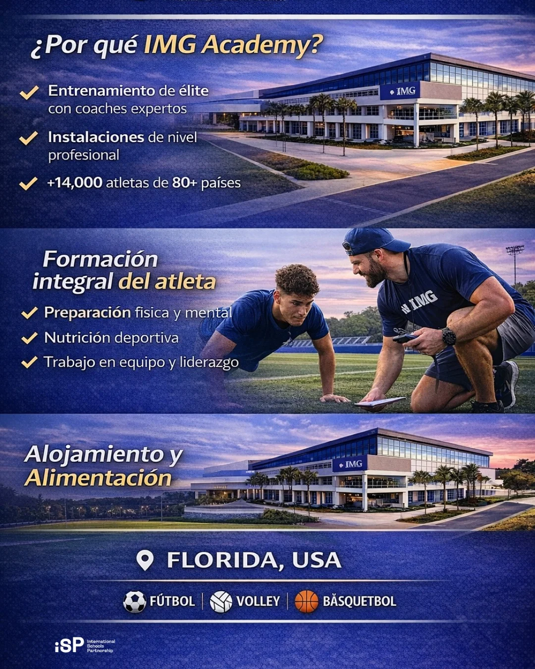 IMG Academy es una institución con prestigio internacional por su enfoque integral en el desarrollo deportivo, físico y personal de niños y jóvenes. Cada año recibe estudiantes de más de 80 países, ofreciendo entrenamiento estructurado, instalaciones de primer nivel y un entorno seguro y formativo.
